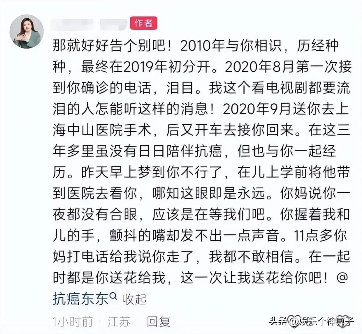 另外前妻也發文解釋網友心中的疑惑,並非因爲前夫患病才離婚,狠心拋棄,而是離婚後一年,才知道確診的消息,之後的三年也經常看望和陪伴前夫,並把兒女帶來,讓東東見最後一面。