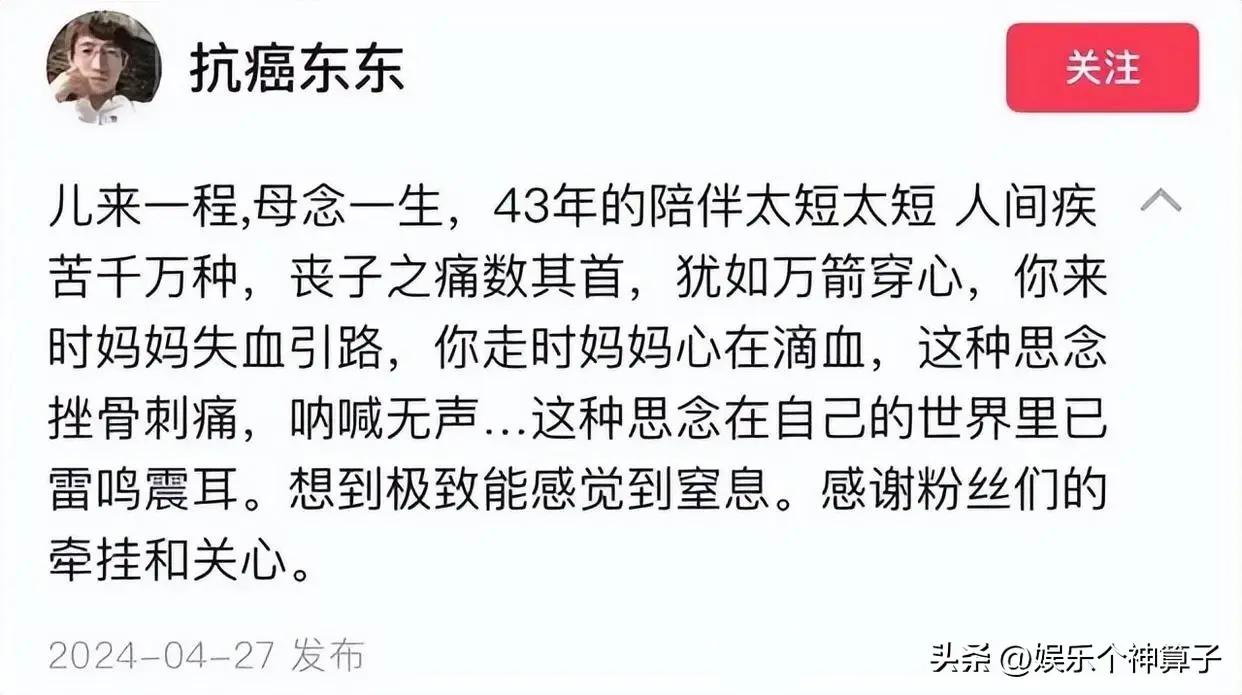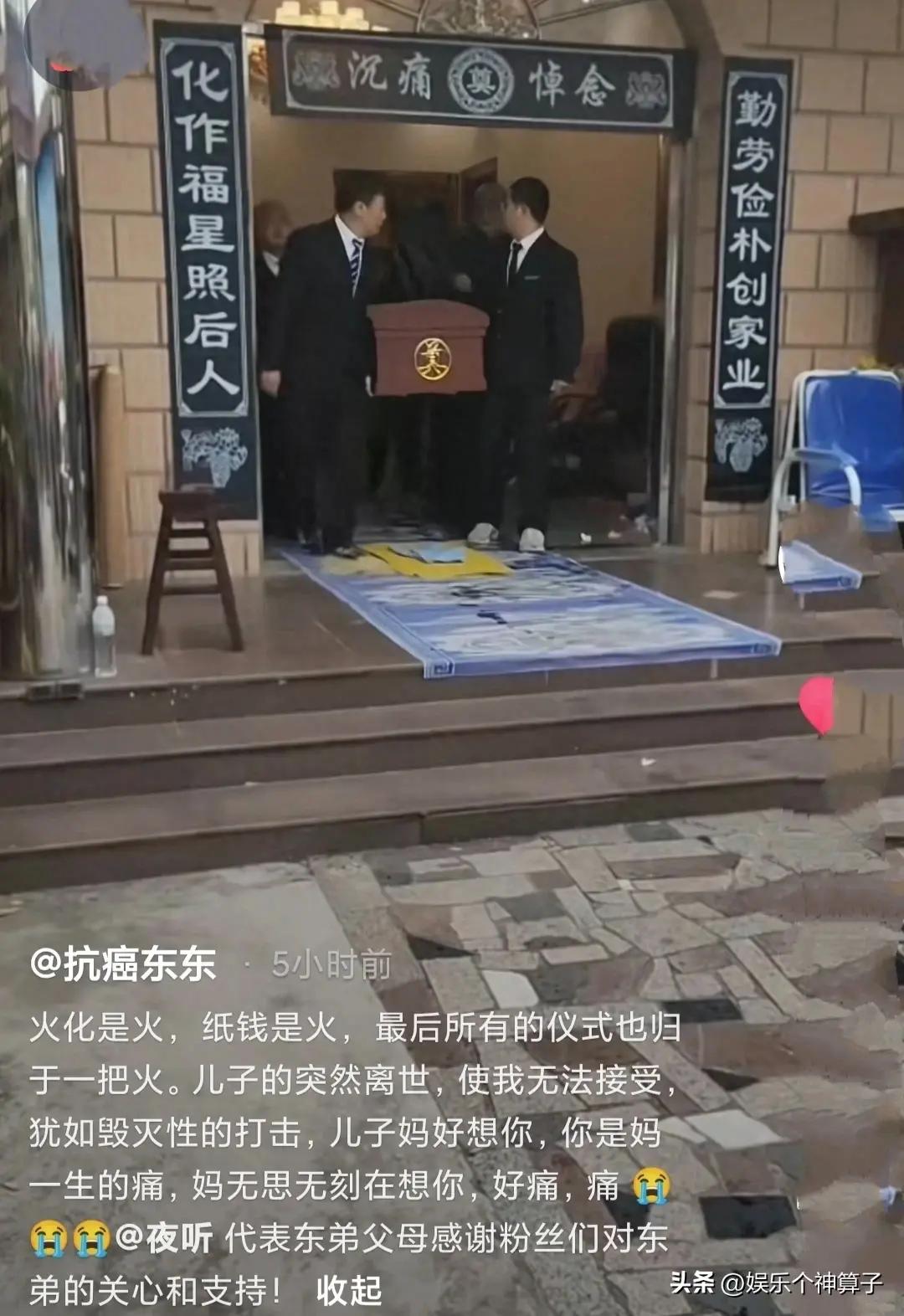 4月30日,抗癌網紅東東去世後的第四天,舉行了出殯儀式,母親在社交平臺發文,表達對兒子的思念,並代表家人感謝粉絲們一如既往的關心和支持,同時也分享了現場視頻。