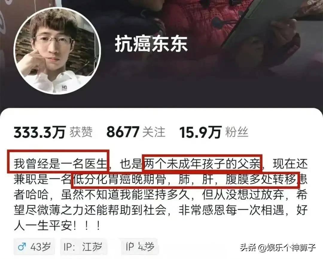 網紅東東本是一名帥氣的醫生,直到胃癌晚期,依舊沒有放棄,惦記兩個孩子,還想着能幫助他人,讓人敬佩。