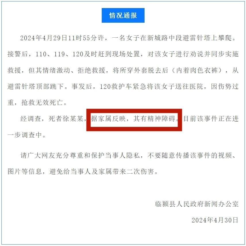 比如一名女子爬上避雷塔跳下身亡,有人爆料說她是裸貸了,照片還被債主發給她的親人了,女子受不了打擊就輕生了。警方通報的真相是女子有精神障礙。