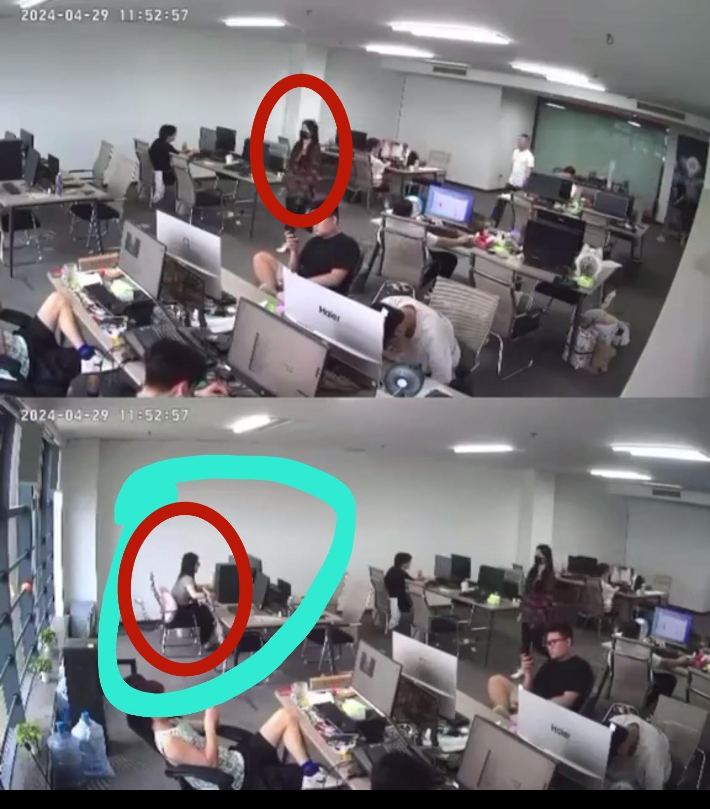 一開始,長髮女子走進辦公室並沒有引起注意,也許他們以爲長髮女子是來辦公室找朋友的。