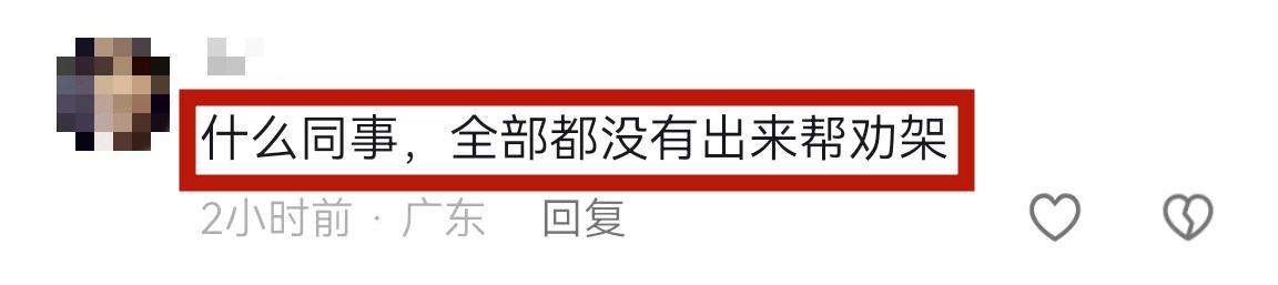 有網友吐槽灰衣女子的同事冷漠,質疑他們看着自己的同事被打,爲什麼不上前幫忙,而只是傻傻的看着。甚至有網友吐槽灰衣女子的男同事沒有血性,沒有男子氣概。