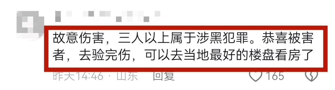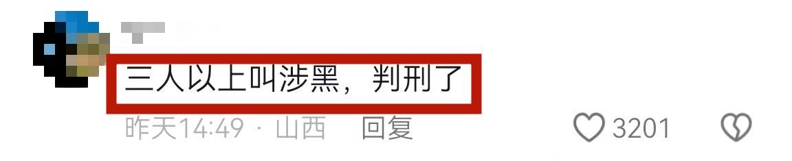 對於毆打灰衣女子的3人,很多網友認爲他們是三人團體,是涉黑,可以判刑。還說他們犯有故意傷害罪,其中一人手拿菜刀鬧事,更是罪上加罪。