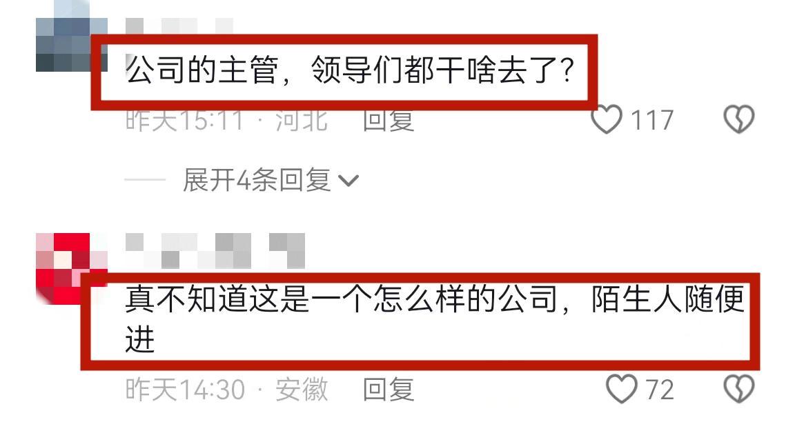 有網友吐槽灰衣女子所在公司管理不善,吐槽爲什麼讓3個不明身份的人就這麼輕易進來鬧事。