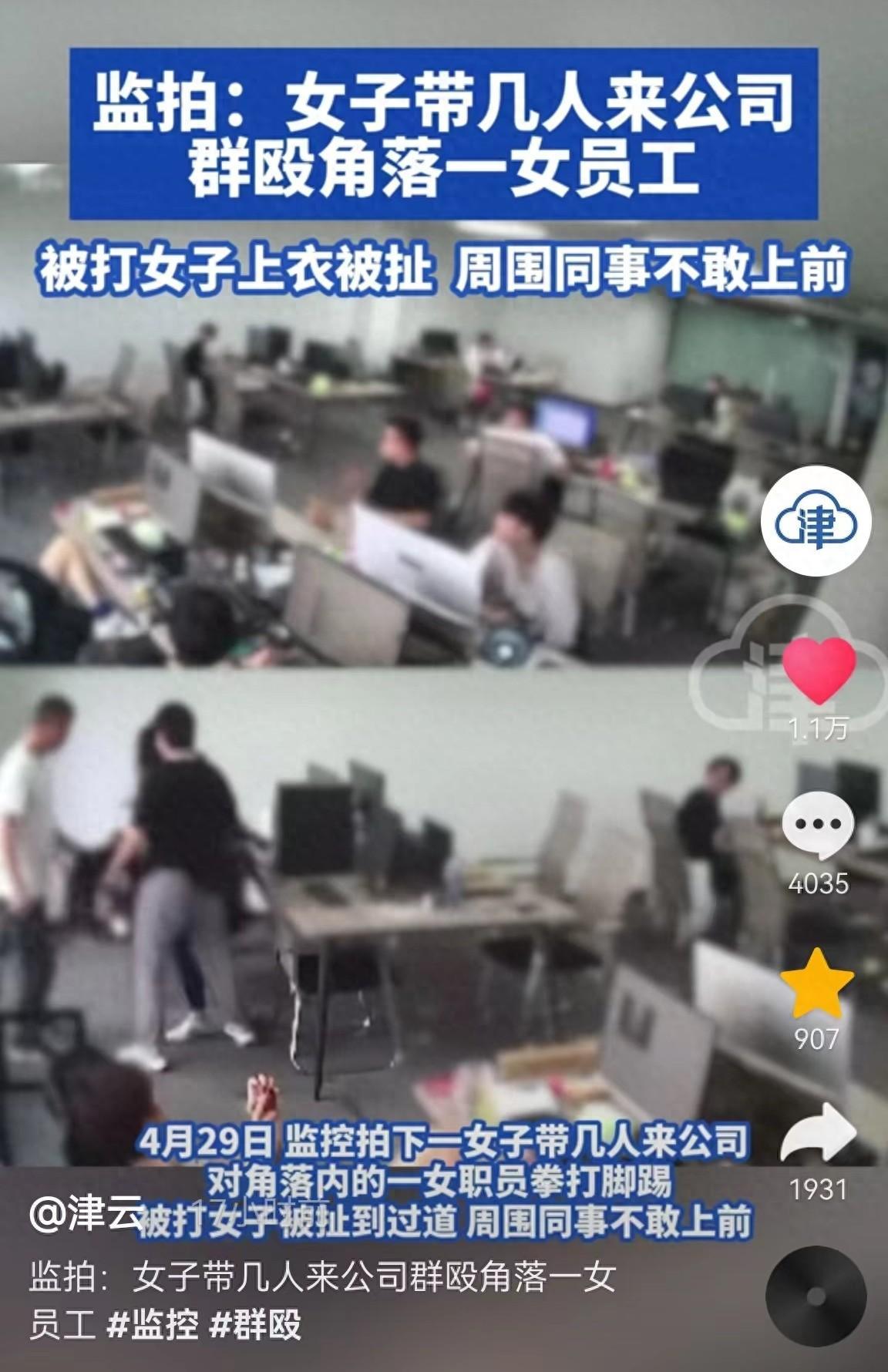 4月30日,媒體賬號津雲曝光了某公司內部的一段監控視頻,視頻內容主要是一名灰衣女子遭到3人毆打,視頻畫面觸目驚心,令人髮指。