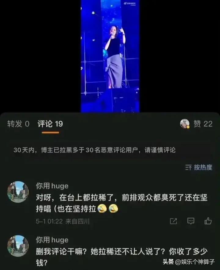 然而,這還不是最尷尬的,演唱會現場的網友發文爆料,稱張韶涵在崑山演唱會當場拉稀,因爲自己買的前排座位,離的比較近,聞到一股臭味飄過來。
