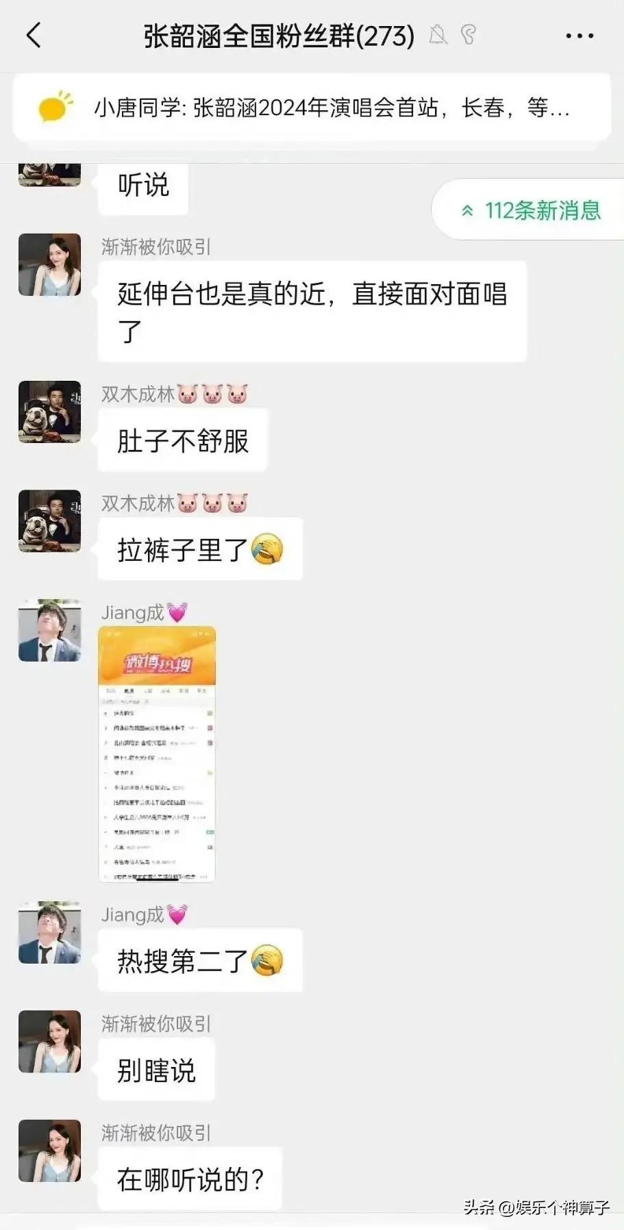 此外,粉絲羣也在討論這件事情,稱延伸臺比較近,已經面對面的唱了,肚子不舒服,拉褲子裏了,還上了熱搜第二。