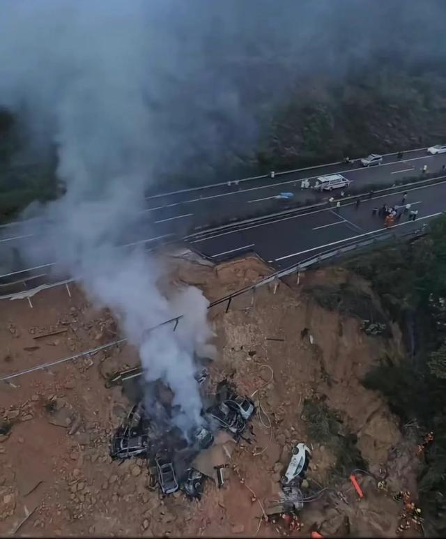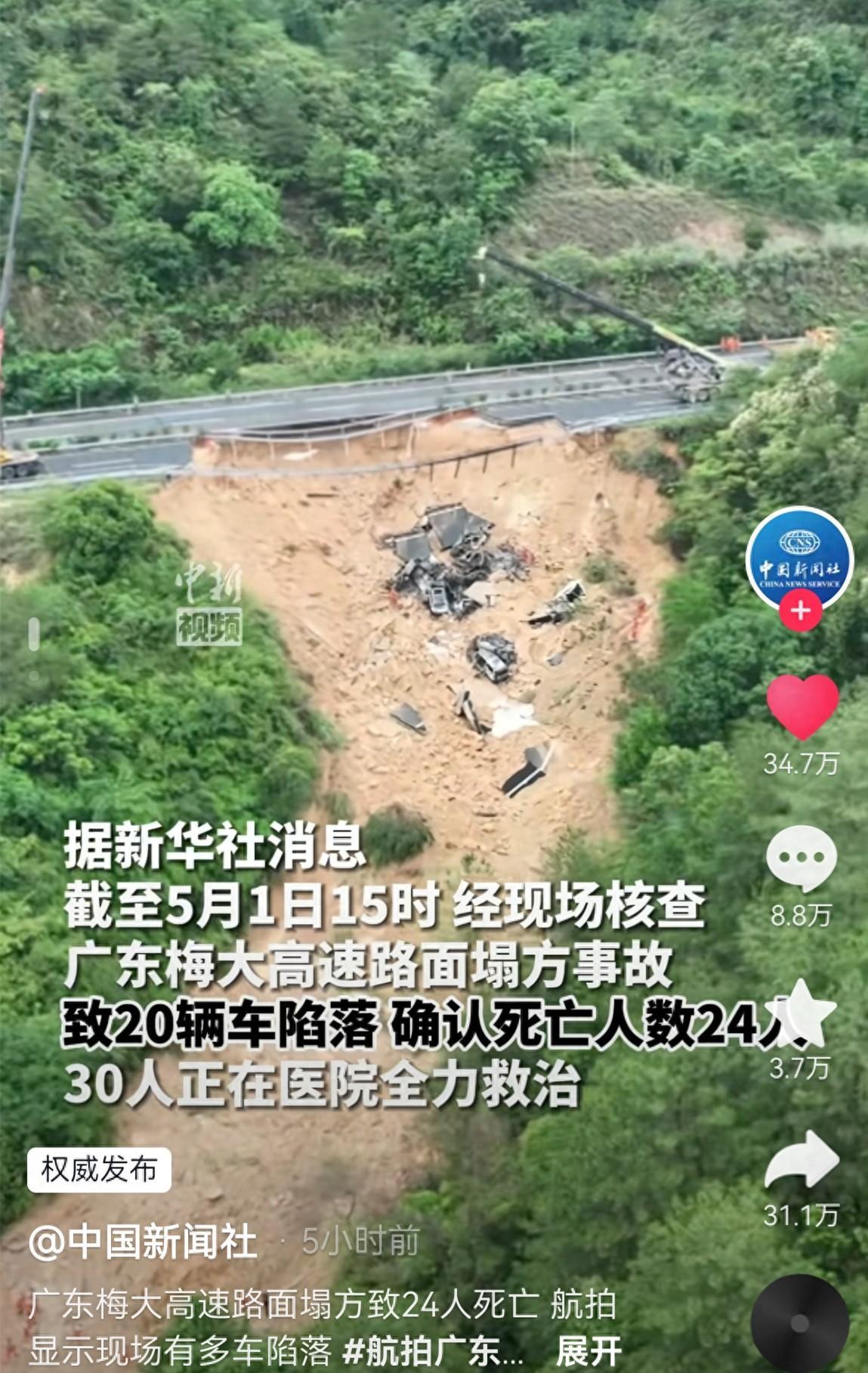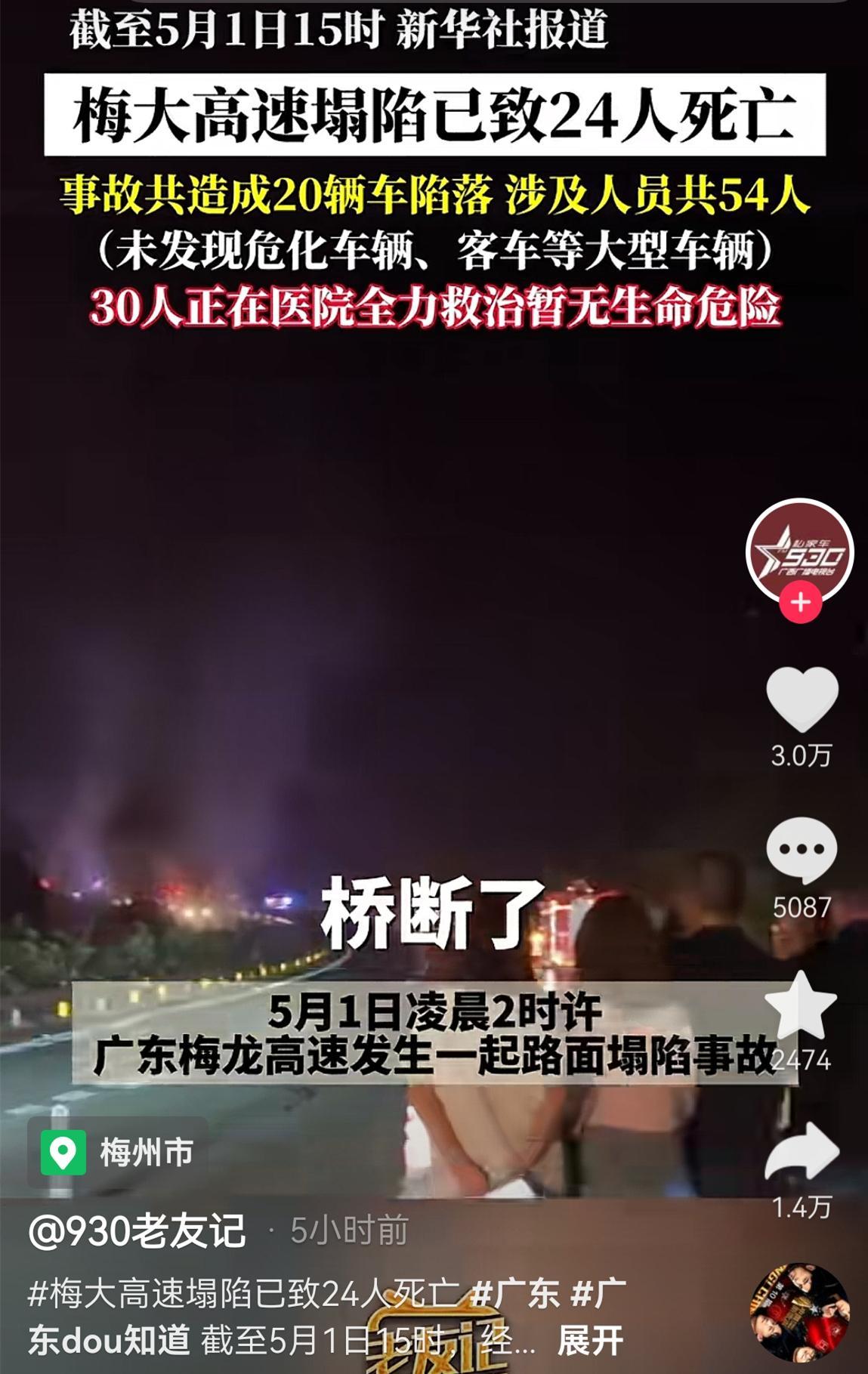 5月1日清晨,有多位網友爆料稱梅大高速發生嚴重的坍塌事故。