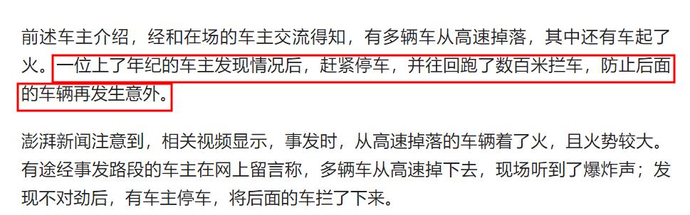 一位在現場的車主則爆料說當時事故發生後,一位上了年紀的車主在發現情況後,第一時間停車,隨即往回跑了數百米攔車,防止後面的車輛再發生意外。