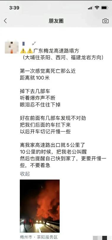另一位網友則發朋友圈說她第一次離死亡這麼近,當時她的車離事發路段只有100多米。
