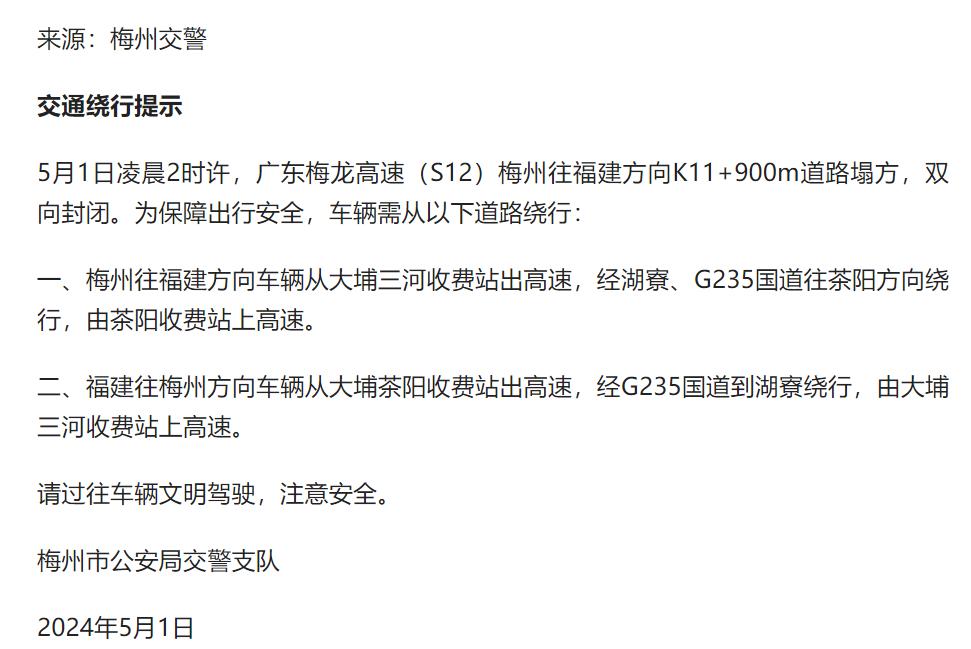 到了早上7點多,梅州交警發佈交通繞行提示,提示中寫明5月1日凌晨2時許,廣東梅龍高速(S12)梅州往福建方向K11+900m道路塌方,雙向封閉。