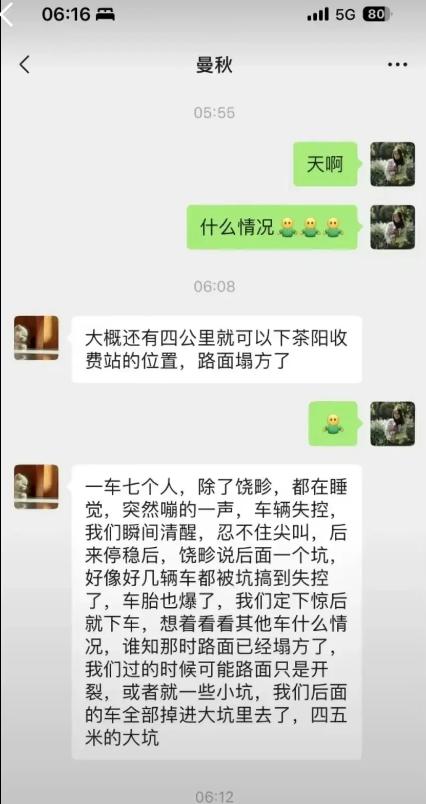 一位在事故發生前離開坍塌路段的網友說他們當時一車7個人,忽然聽見嘣的一聲,車上睡着的人都被驚醒了。他們隨即停車,發現後面的路段坍塌了,出現了一個四五米的大坑,很多車輛掉入了大坑之中。