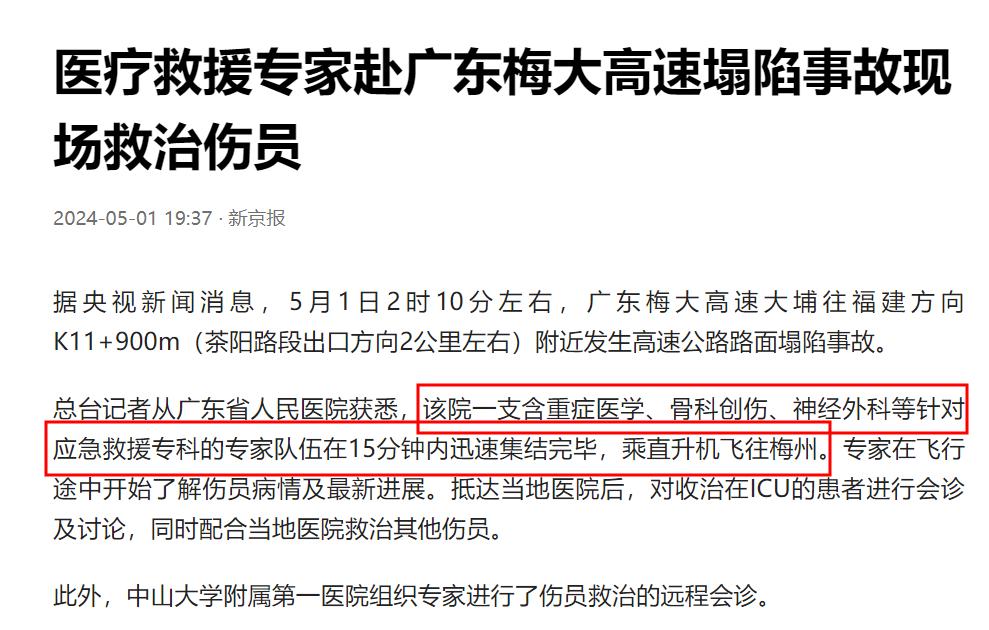 廣東省人民醫院的一支專家隊伍在15分鐘內集結完畢,乘坐直升機前往梅州,從而展開救治工作。