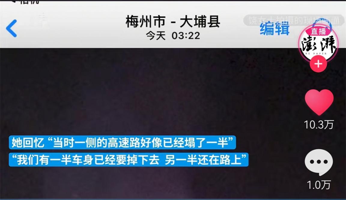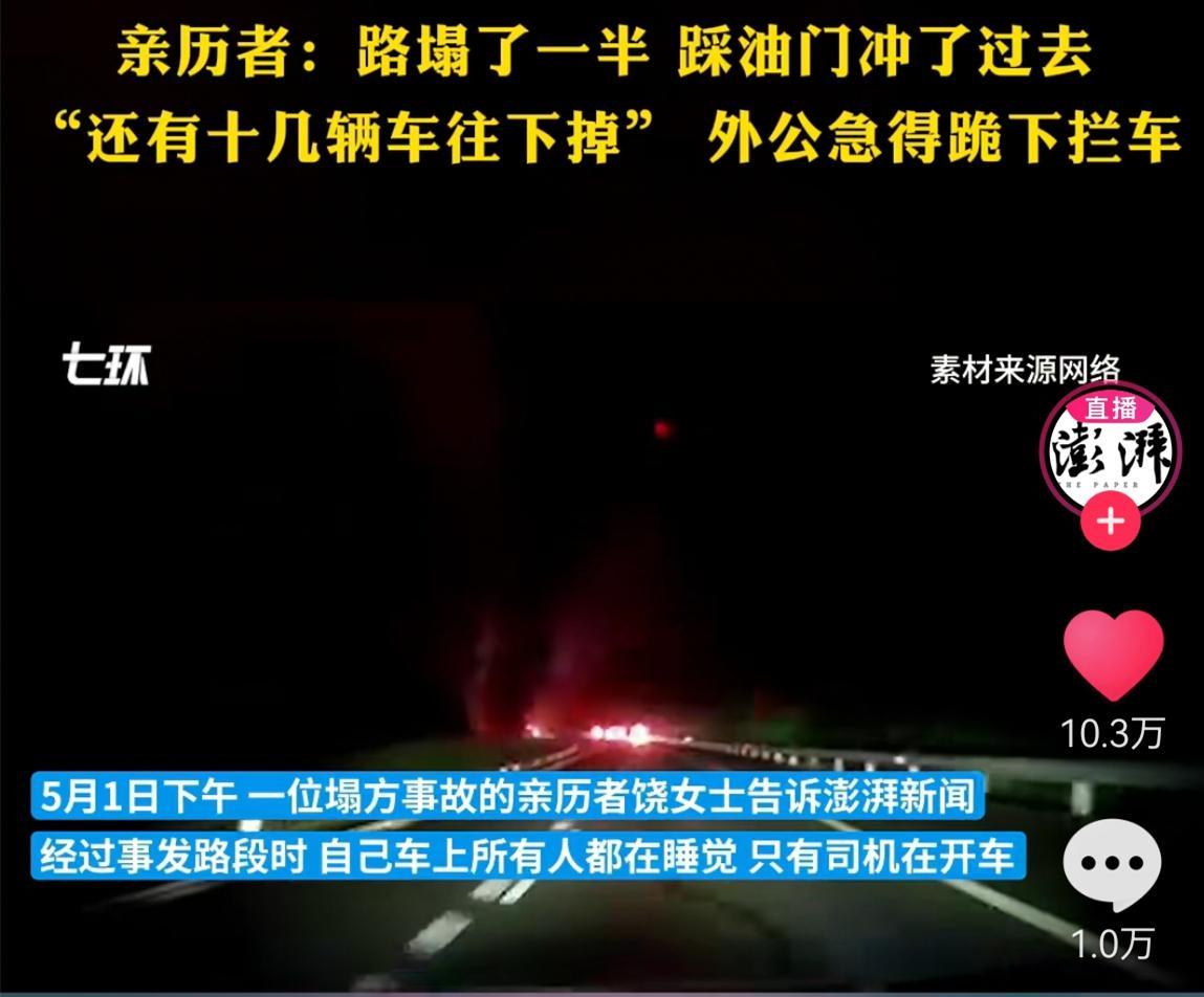 隨着嘣的一聲,一車的人都被驚醒了,他們發現一側的高速路好像已經塌了一半,他們的車子一半車身已經要掉下去,另一半還在路上。