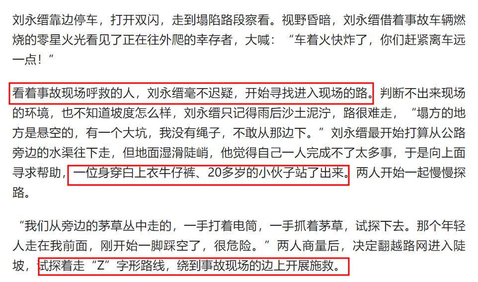 根據網傳信息和媒體的採訪可知,當時劉永縉靠邊停車來到塌陷路段察看,他看到很多車輛在燃燒,聽到有人在呼救。