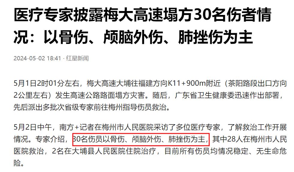 根據專家的介紹,30名傷員主要以骨傷、顱骨外傷、肺挫傷爲主,其中28人在梅州市人民醫院救治,2人在大埔縣人民醫院住院治療。