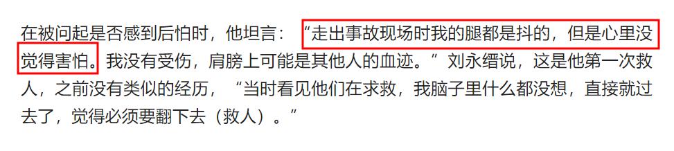 媒體問他當時是否感到害怕,劉永縉坦言“走出事故現場時我的腿都是抖的,但是心裏沒覺得害怕。”