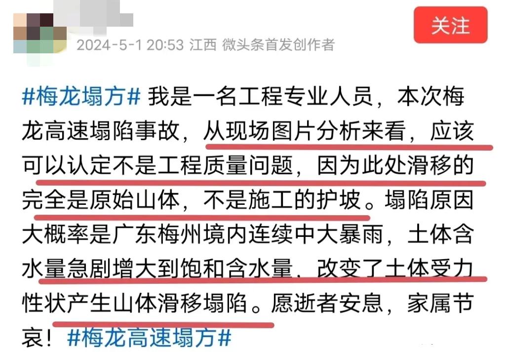有網友則認爲是因爲廣東下了一個多月的雨導致高速坍塌,認爲這是天災。