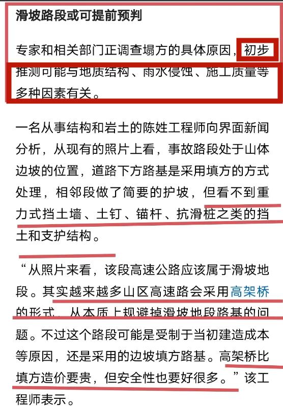 該工程師還說事發高速地段屬於滑坡地段,他說很多山區高速會採用高架橋的形式,從而規避掉滑坡地段路基的問題。但事發路段採用的邊坡填方路基,該工程師猜測施工方可能是爲了節約成本,因爲高架橋要比填方造價貴很多。