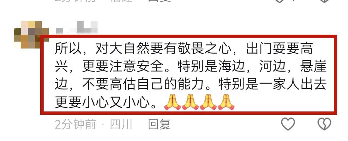 有網友說“對大自然要有敬畏之心,出門耍要高興,更要注意安全。特別是海邊、河邊、懸崖邊,不要高估自己的能力。特別是一家人出去,更要小心又小心。”