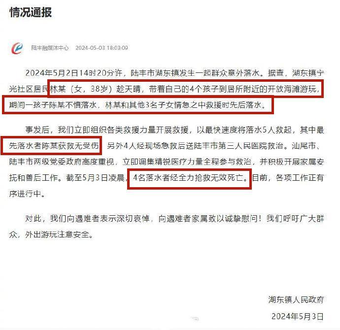 根據通報可知5月2日下午2點多,38歲的湖東鎮寧光社區居民林某帶着自己的4個孩子到家裏附近的開放海灘遊玩。