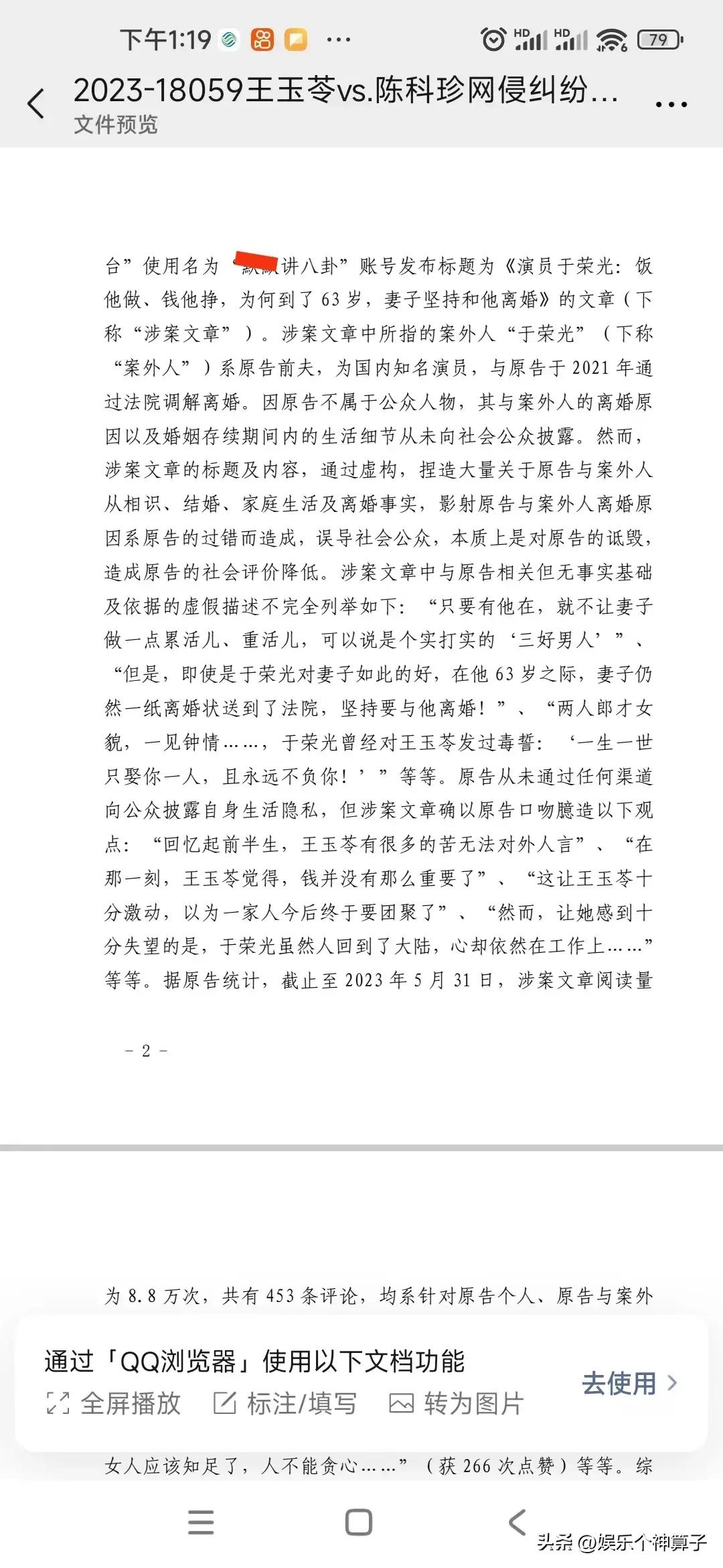 自2023年9月以來,王玉苓就已經委託律師對於網絡相關謠言展開訴訟。目前已經有多個案件結案,均以勝訴而告終。其中自媒體賬號“XX講八卦”在2023年5月發了一篇標題爲《演員於榮光:飯他做、錢他掙,爲何到了63歲,妻子堅持和他離婚》的文章,內容存在着大量虛構、捏造大量王玉苓與於榮光從相識、結婚、家庭生活及離婚事實,影射王玉苓離婚是她自己的過錯造成的,造成了王玉苓的社會評價降低。