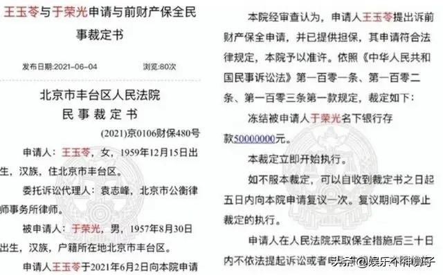 王玉苓於2021年提出了離婚申請,並且向法院申請了財產保全。於榮光突然離婚的消息傳出,引發娛樂圈的廣泛關注,這在當時還登上了熱搜。