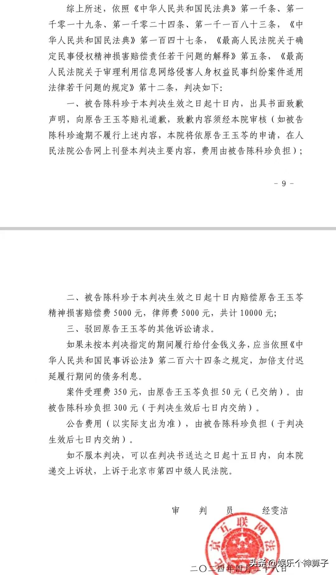 法院最終認定“XX講八卦”賬號主體需要向王玉苓出具書面道歉,並且需要經過法院審覈。經濟方面,賠償王玉苓5000元精神損失費,5000元律師費,共計10000元。