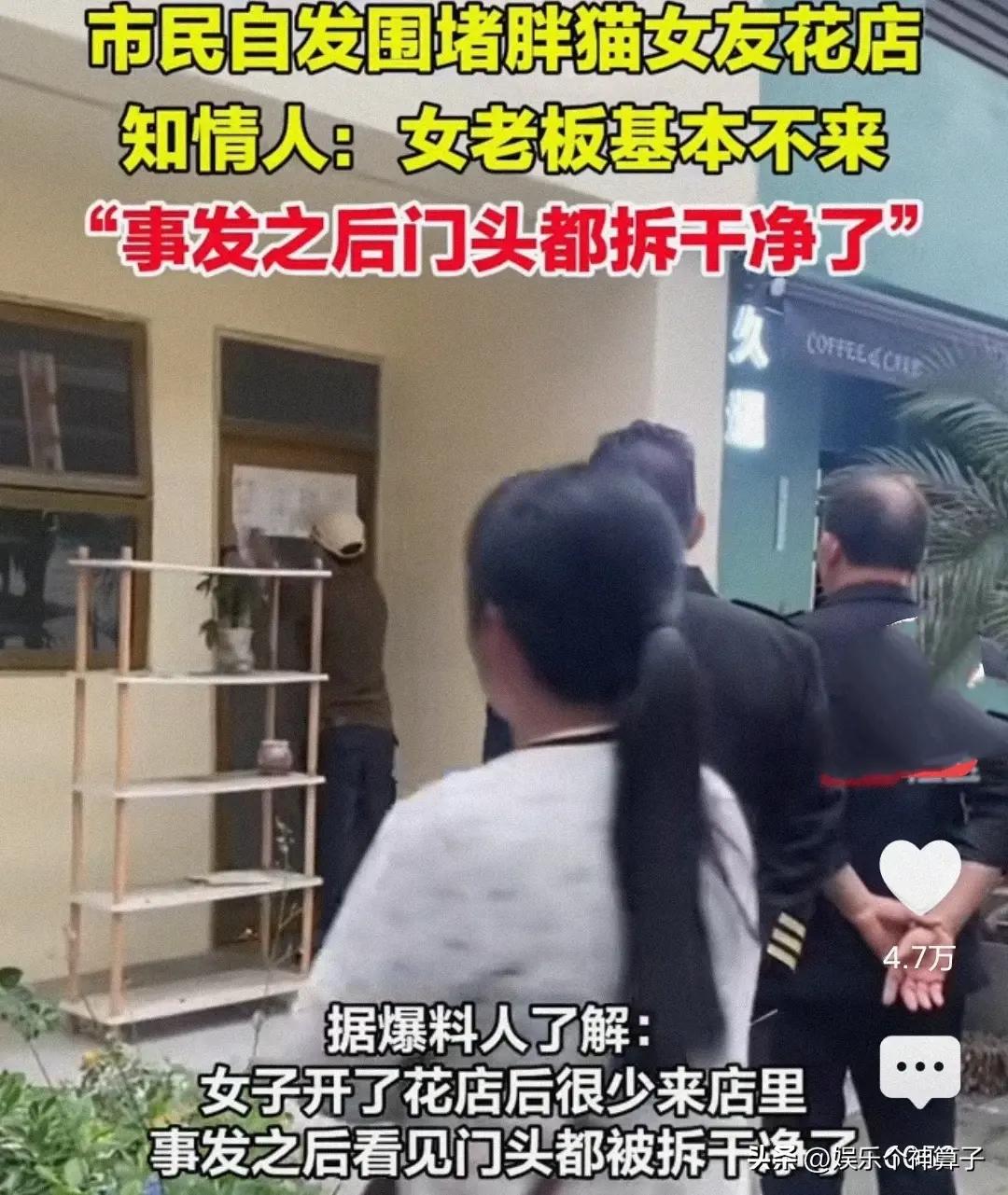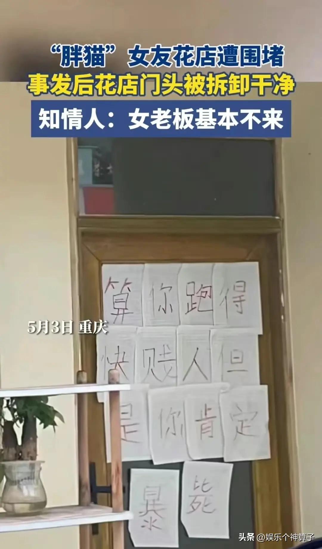 網上爆料,“胖貓”女友的花店遭到圍堵,事發後,門頭已被拆卸乾淨,門上貼滿了字條,一看寫的內容,着實不太友好,再憤怒也不能這樣,知情人透露,女老闆基本不來。