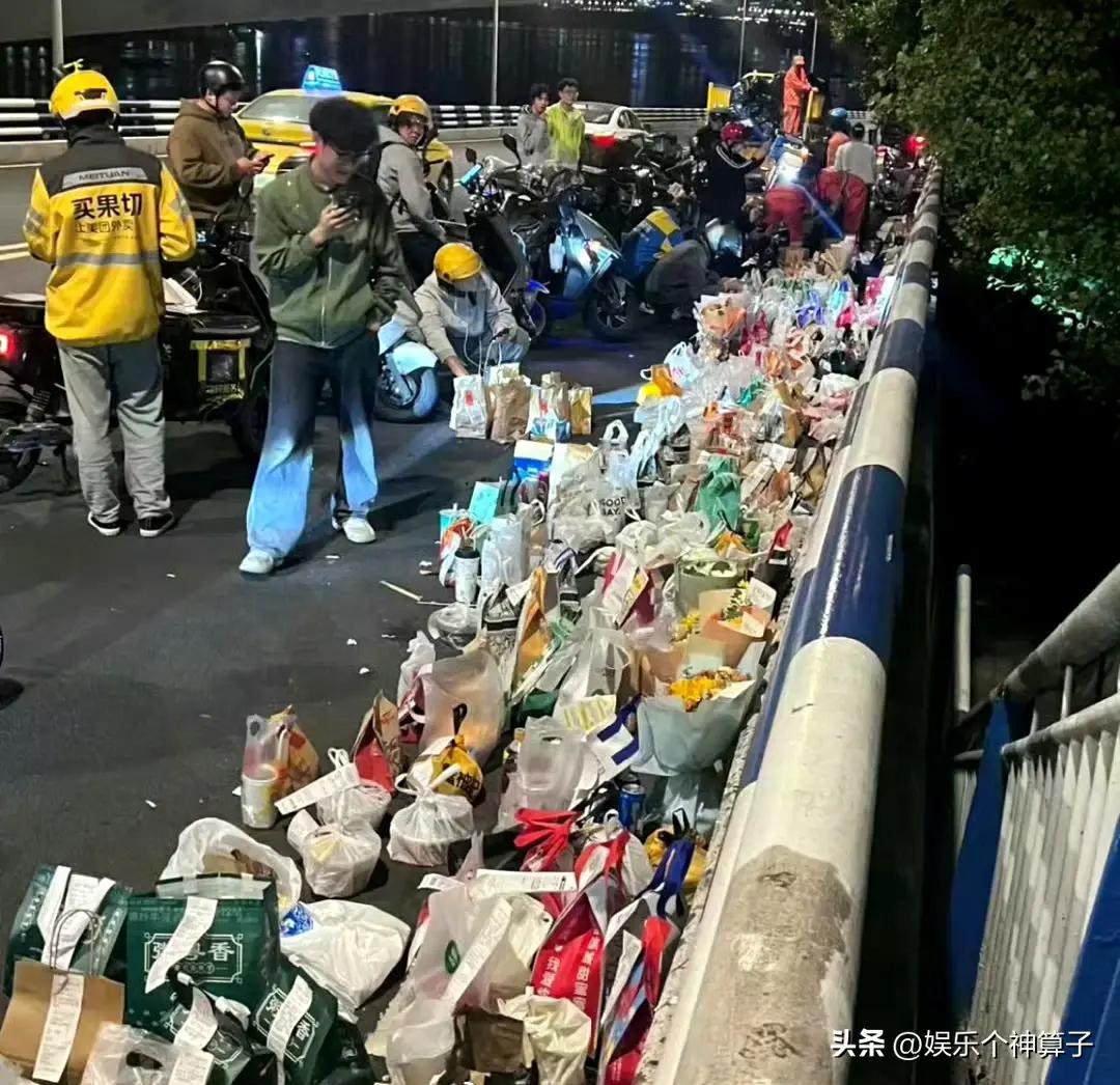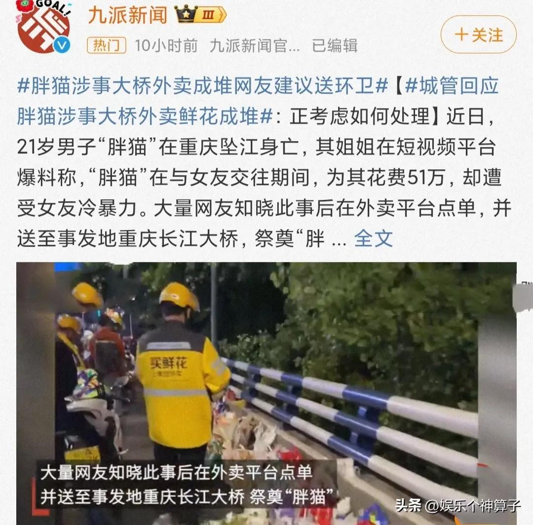 這裏簡單科普一下,“胖貓”爲了給女友攢錢,平時省喫儉用,就連最想喫的麥丹勞都捨不得買,所以,大橋旁邊擺放的除了鮮花,還有很多麥丹勞,按理說,這也是網友的一番好意,只不過,表達的方式有很多種。