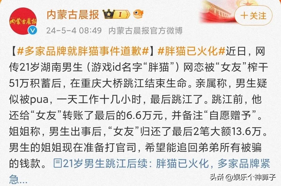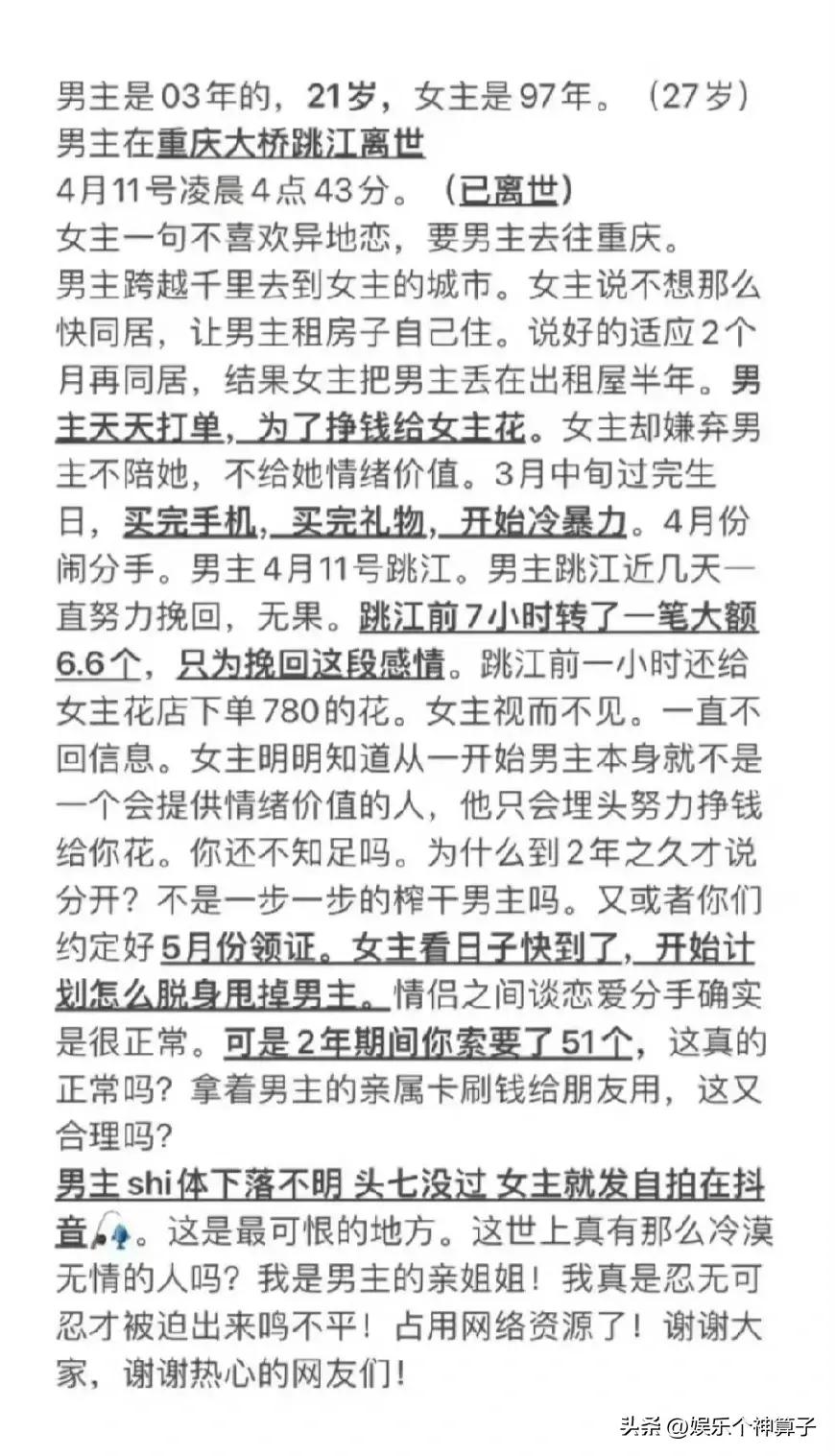 5月4日,21歲重慶男子跳江自殺的消息,多次的登上熱搜,還在持續發酵,“胖貓”姐姐的發文,透露了很多信息,替小夥感到不值的同時,甚至讓一些網友感到憤怒。
