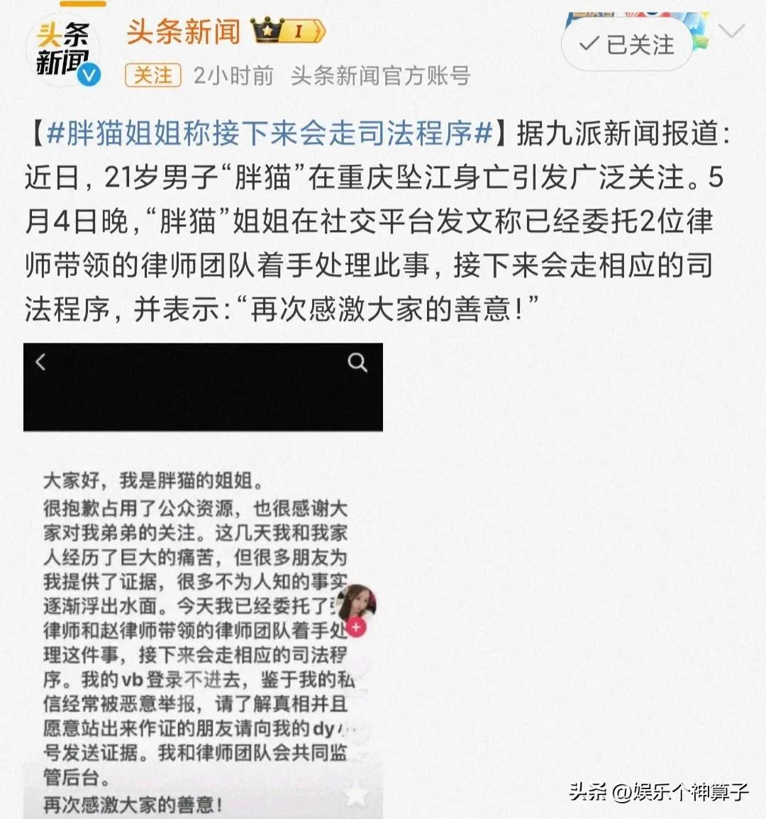 最新消息,“胖貓”的姐姐再次發文,已經委託律師處理此事,接下來會走相應的司法程序,感謝大家的善意。