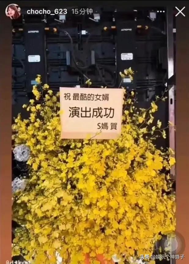 畫面中,舞臺旁擺着S媽送的鮮花,紙板上寫着祝福語:“祝,最酷的女婿演出成功”,看來對光頭十分滿意。