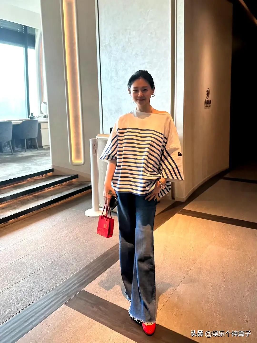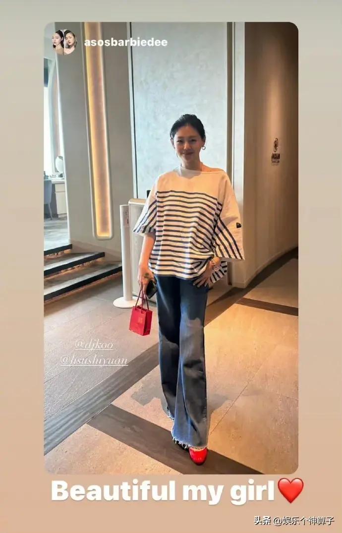 照片中,大S幾乎是素顏出鏡,花紋上衣搭配喇叭筒牛仔褲,臉上還穿着紅色高跟鞋,拎着一個禮物袋,戴着昂貴的手錶,整個人容光煥發,出來見友人,特意換了一身新衣服,喬裝打扮一番,真的好美。
