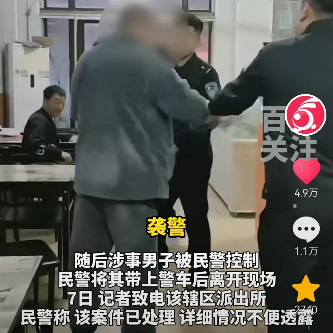 在男子做出襲警行爲後,三位民警便將該男子控制住了,在曝光的現場視頻最後,可以看到男子被帶上了警車。