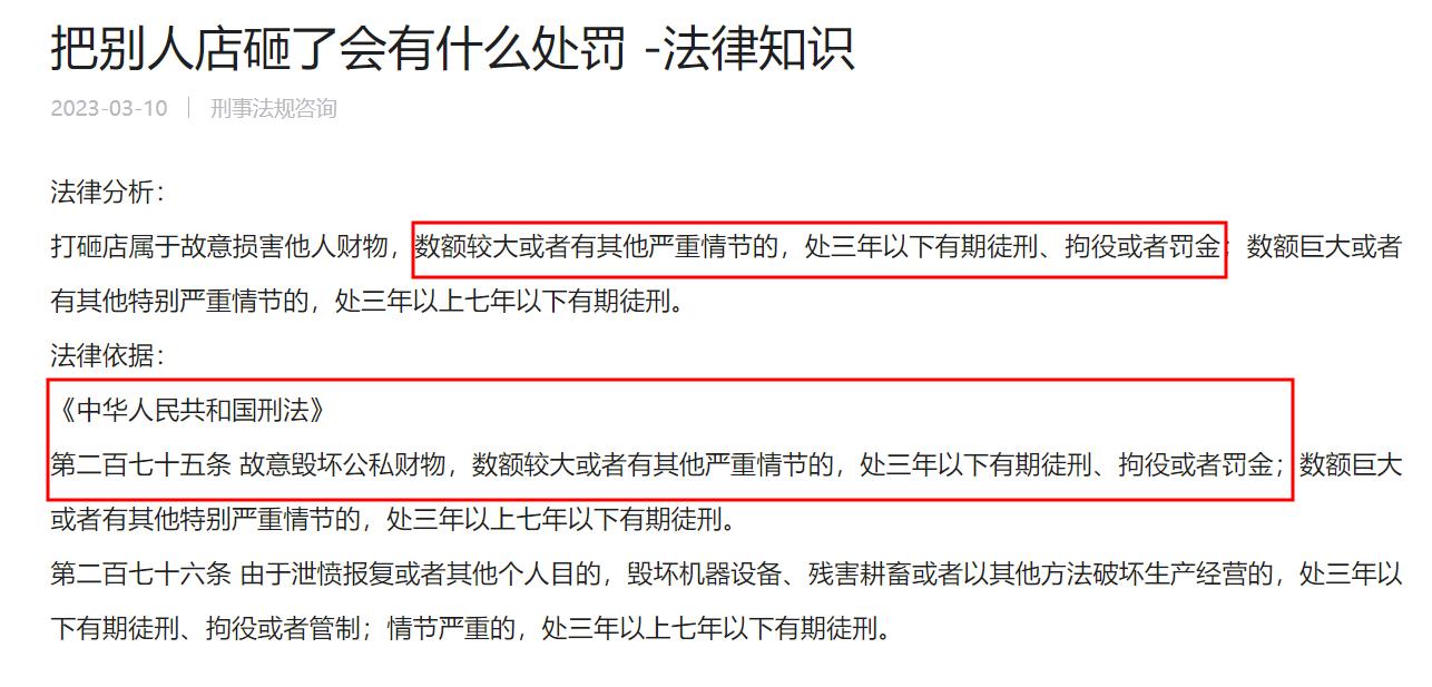 筆者查詢相關法律法規發現,故意毀壞他人財物,數額較大或者有其他嚴重情節的,處三年以下有期徒刑、拘役或者罰金。