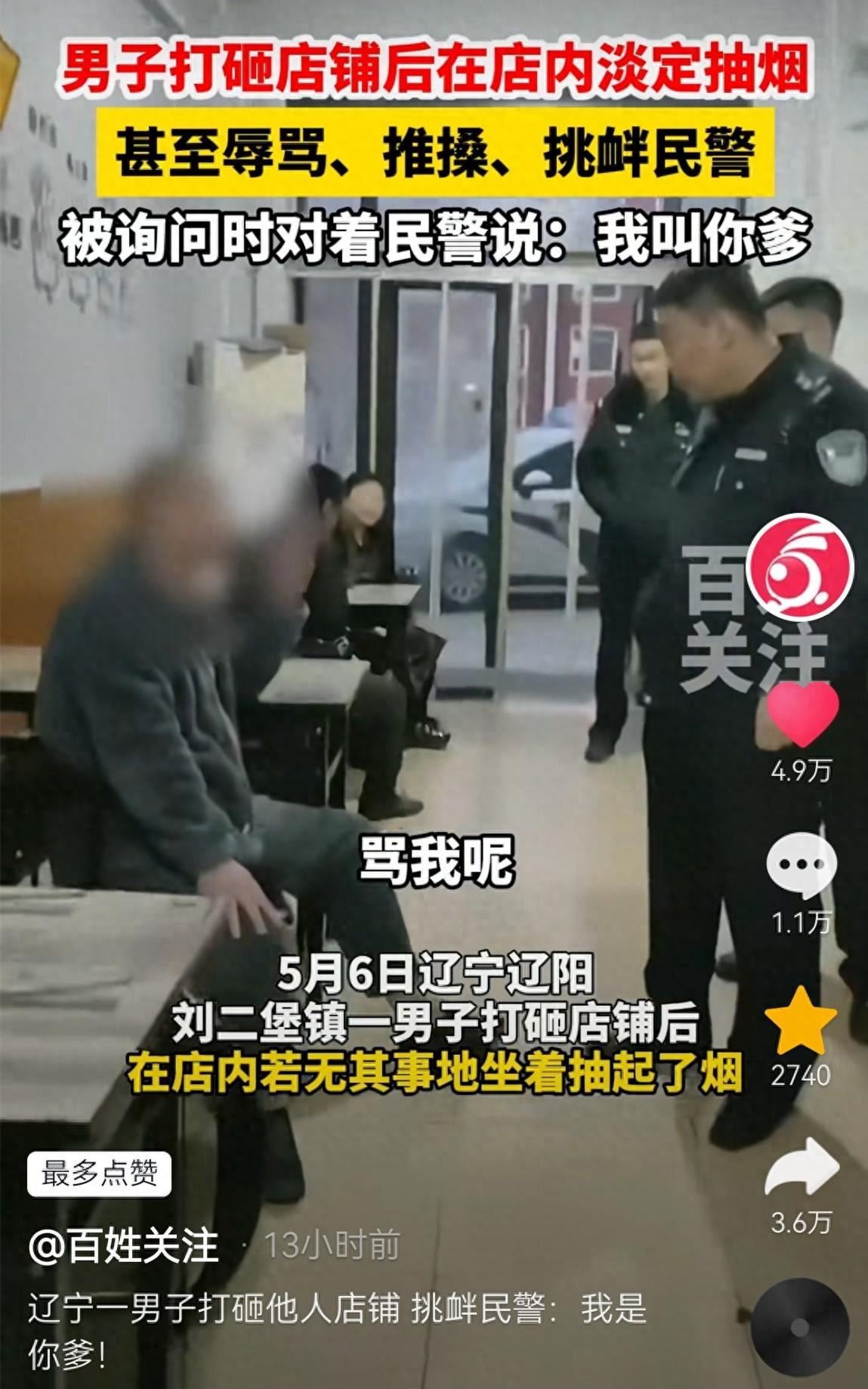5月7日,官媒百姓關注報道了遼寧一名男子打砸他人店鋪並挑釁民警的事情。