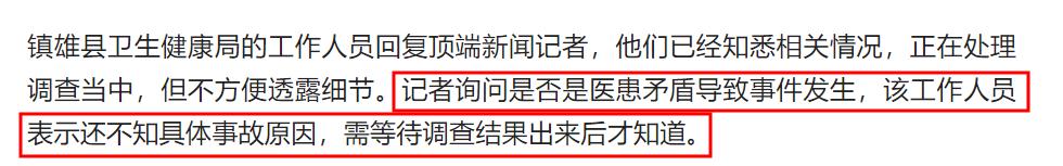 至於是否真的存在醫患矛盾,對於此,鎮雄縣衛生健康局回應稱目前還不知道事故具體原因,需要等待調查結果出來後才能知道。