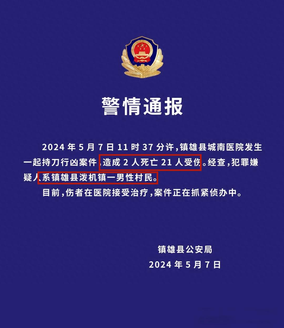 對於第一個問題,根據媒體的報道可知,事發於鎮雄縣人民醫院城南院區。根據鎮雄警方發佈的通報可知,此次持刀行兇事件,造成2人死亡,21人受傷。