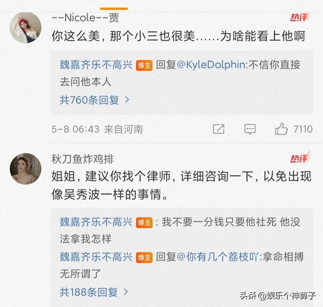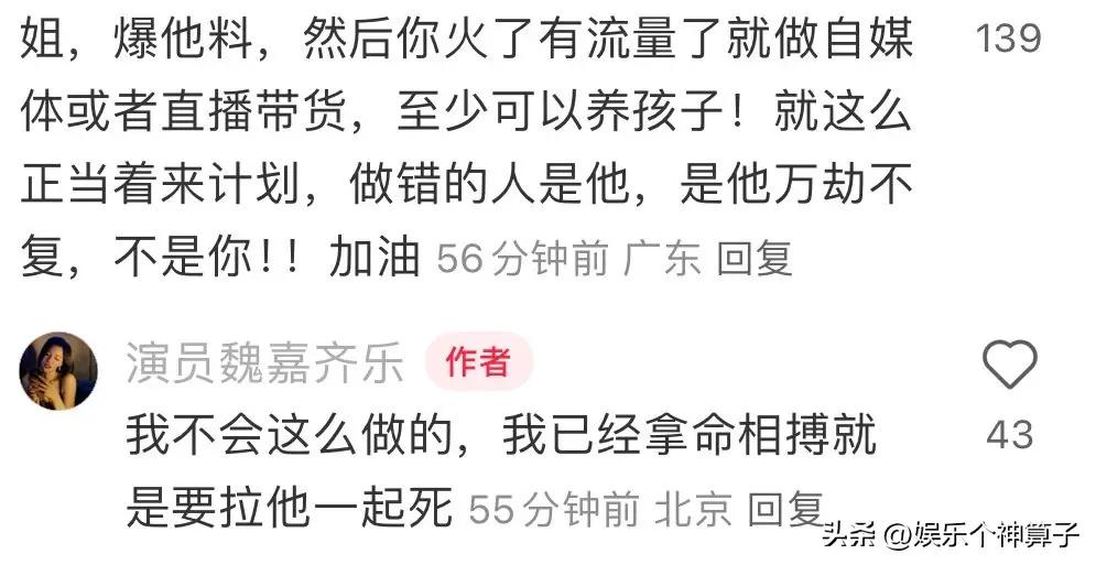 也有網友建議找個律師,詳細的諮詢一下,魏嘉表示,一分錢也不想要,就是要他塌房,一切都無所謂了。