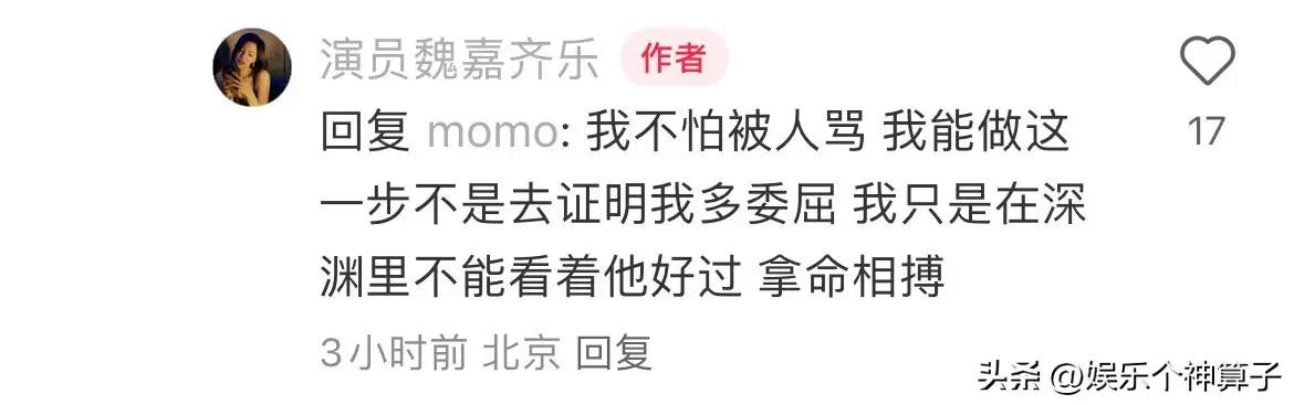 按照魏嘉的說法,之所以出來爆料,已經被逼到了絕望的境界,被娃的父親pua了三年,還被罵是免費的wai圍,忍無可忍,像痛快的直接一了百了。