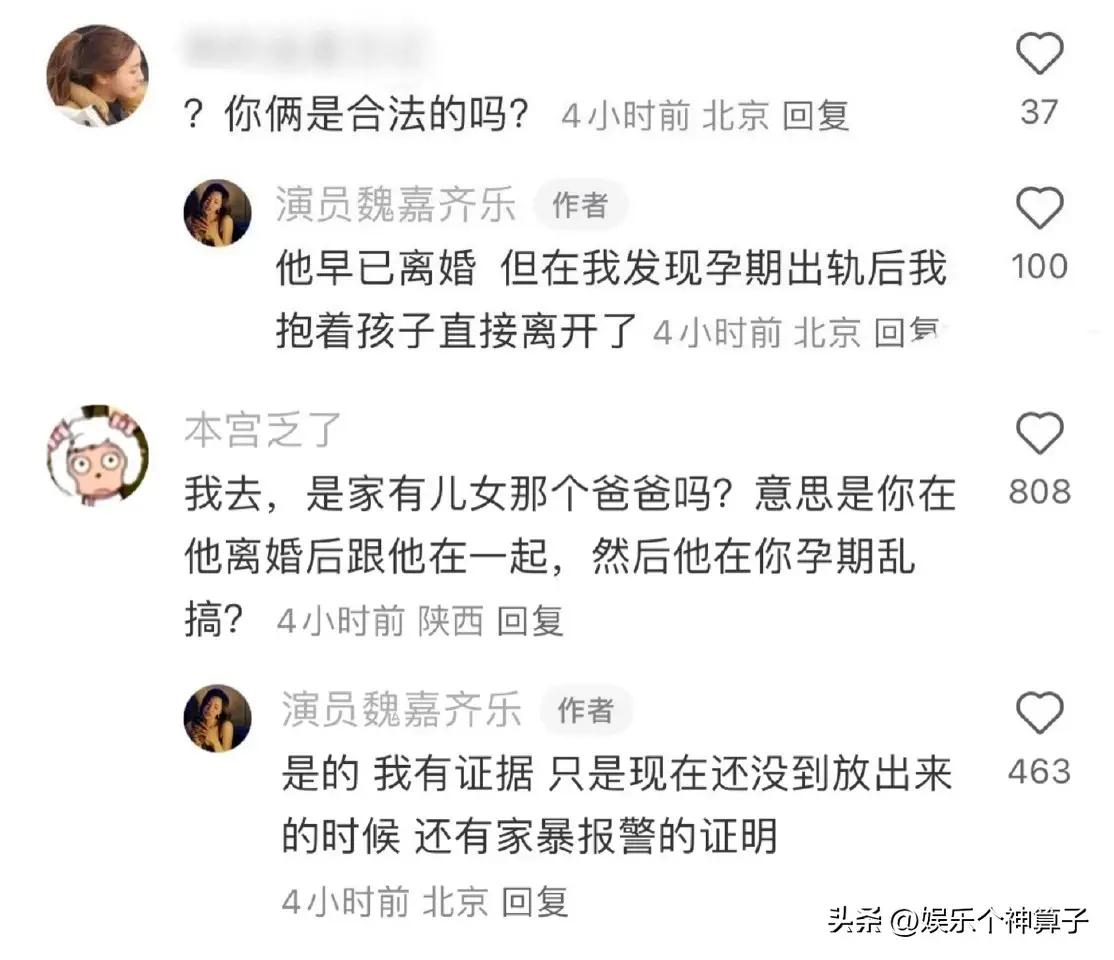有網友詢問,你們是合法夫妻嗎?魏嘉回應:他離婚,當我發現孕期出軌後,就立刻抱着孩子離開了。