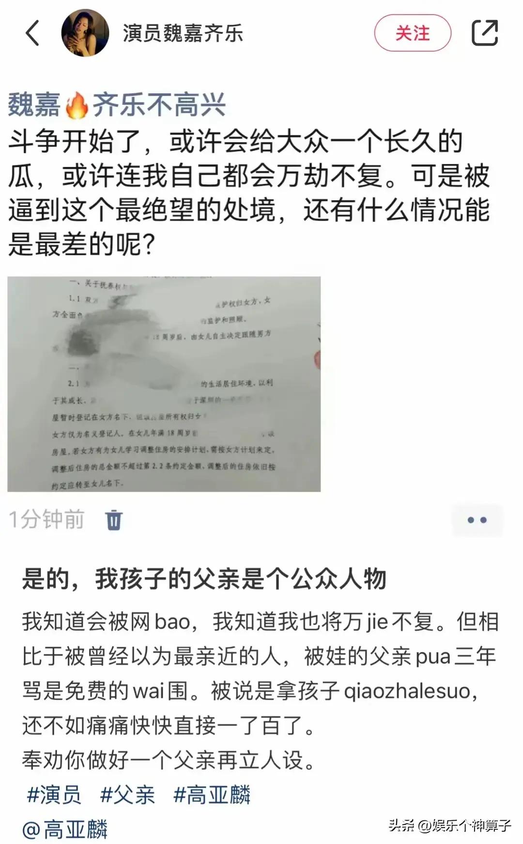 女演員魏嘉凌晨在社交平臺發文,特意艾特高亞麟,曝其出軌家暴,並配文:“出軌帖,既然要喫瓜,就徹底撕破臉”。