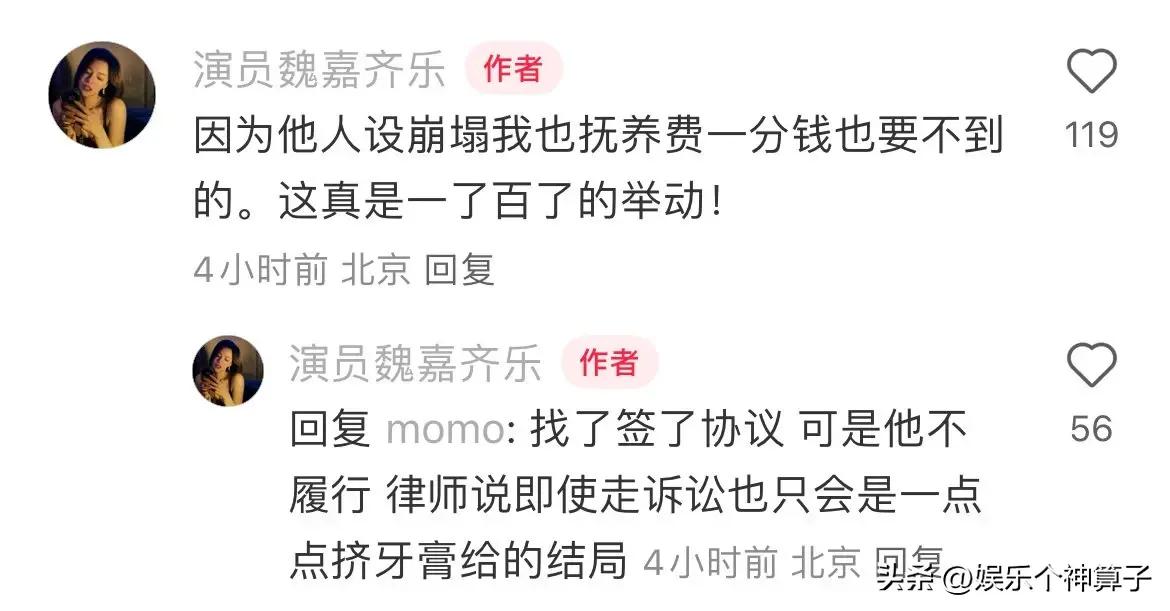魏嘉還透露,兩人已經簽了撫養協議,但是男方不履行,諮詢一下律師,即使起訴,也不會有太大的作用。