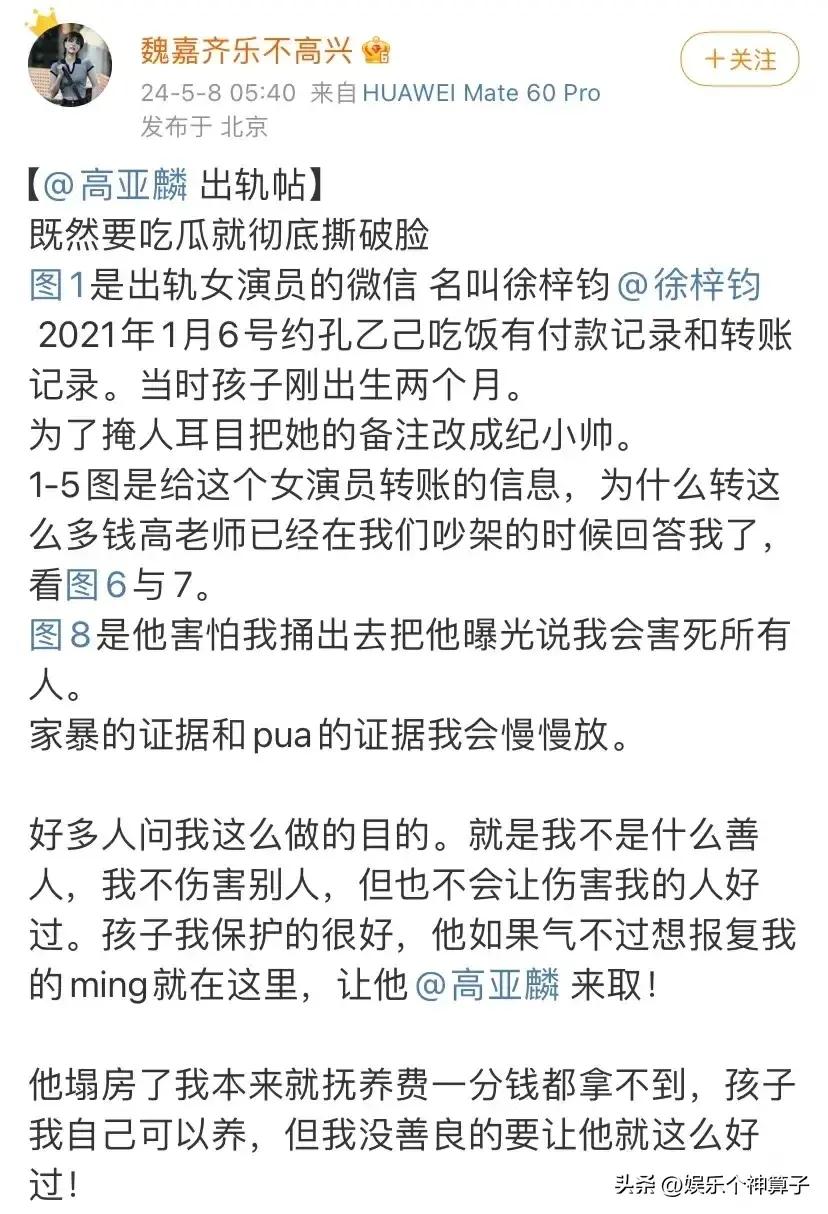 大瓜!魏嘉凌晨發文,曝高亞麟孕期出軌,曬出聊天截圖和轉賬記錄