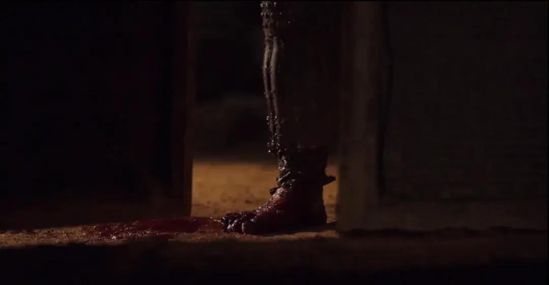 沉重的腳步聲駐足門外,一個穿着日本鎧甲的巨人身影停在門前,浸滿血的腳掌觸目驚心。