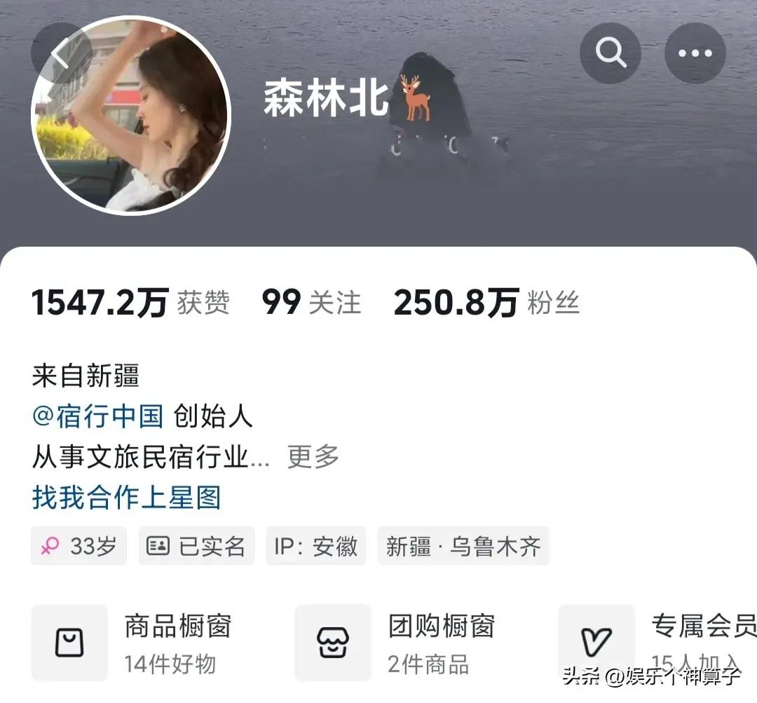 出於好奇,特意到網上科普一番,查找到網紅“森林北”的社交賬號,坐擁百萬粉絲,有一定的知名度,意料顯示來自新疆,年齡33歲,還是一位創始人,可謂非常優秀。