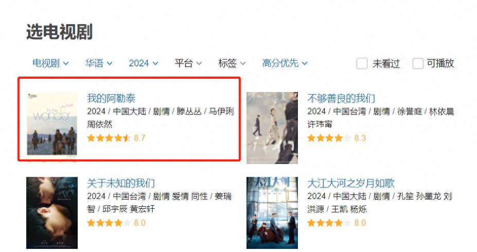 比如在央視播爆了的《我的阿勒泰》,豆瓣開分8.5,隨着後續口碑的持續發酵,如今評分已經漲到8.7了。