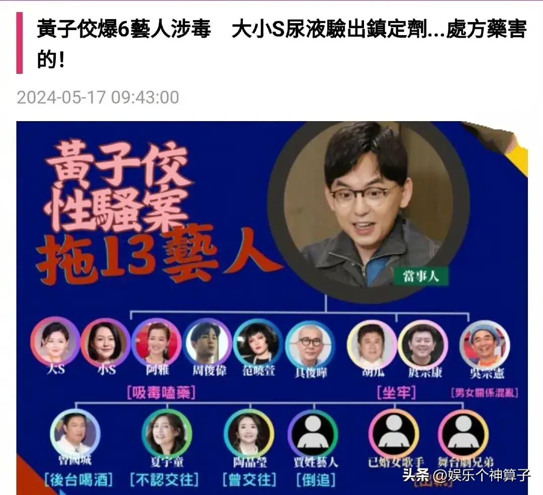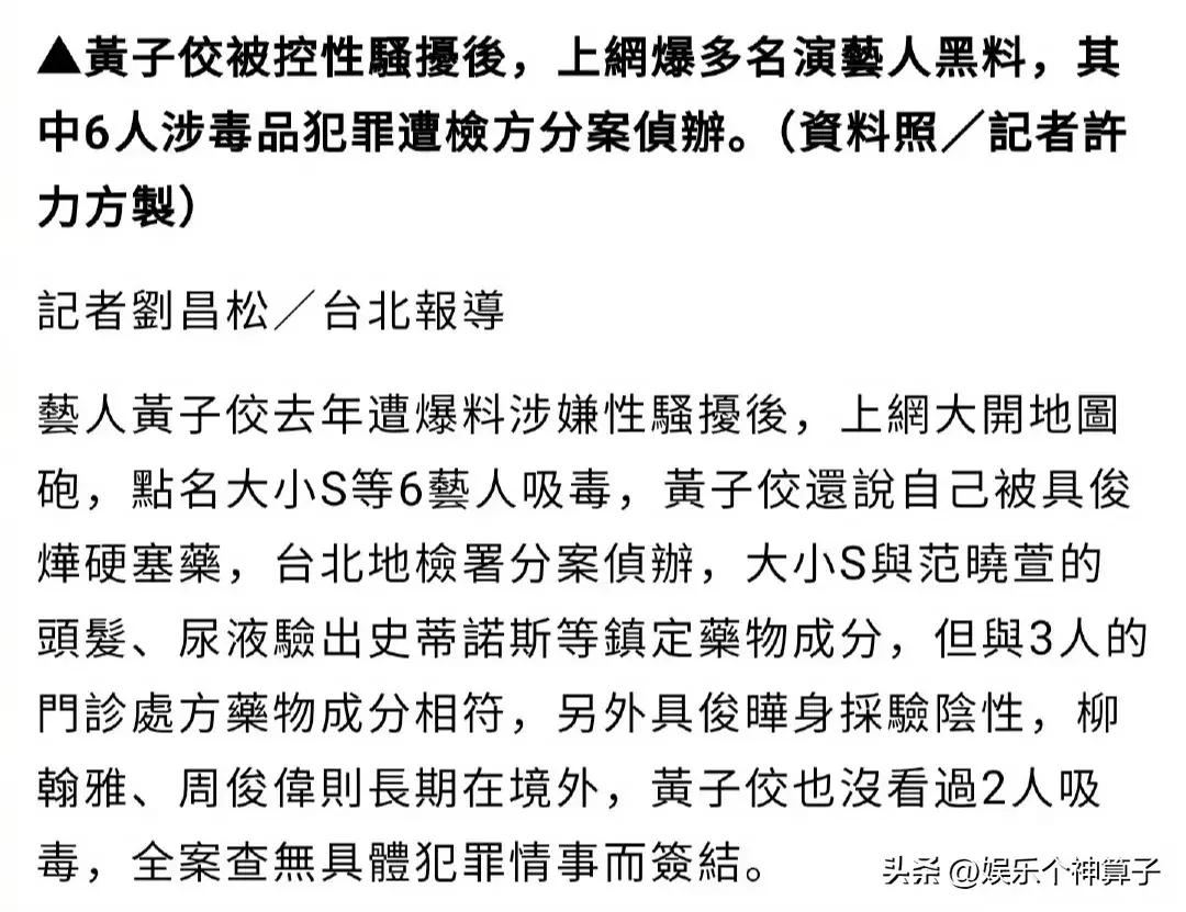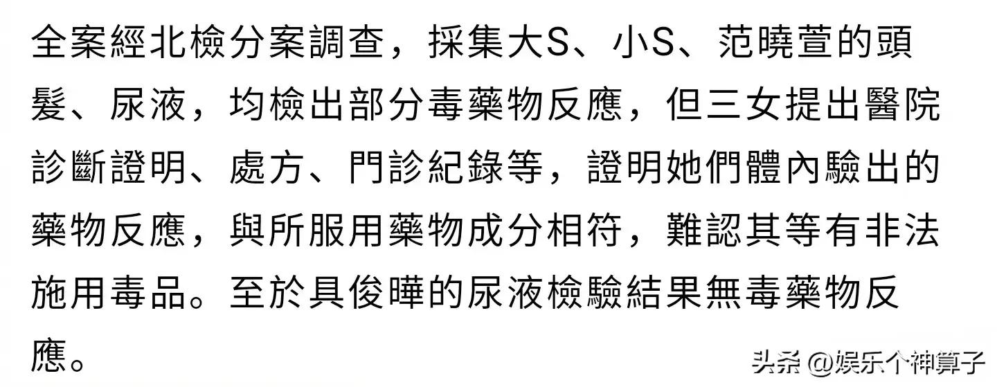 5月17日,對於大S來說,絕對是個好日子,據臺媒報道,黃子佼控大小S吸毒案因查無具體犯罪情事結案,此外,尿檢結果公佈:有鎮定藥物成分,但與門診處方藥物成分相符。