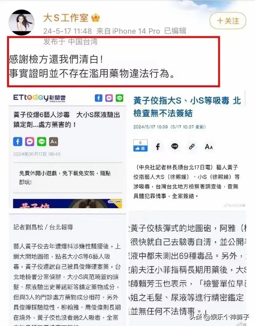 隨後,大S工作室在社交平臺發文,感謝檢方,稱:事實證明不存在濫用藥物行爲。並曬出臺媒報道此事的截圖!